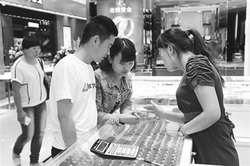 正值周末,在北京某大型国营黄金首饰商场,黄金饰品销售火爆,戒指、项链、耳环等柜台,被选购黄金的消费者围得水泄不通。