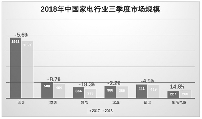 Q3报告显示,2018年三季度中国家电市场整体规模为1821亿元,同比下降5.6%。其中,黑白电、厨卫等大家电均出现不同程度的下滑,空调市场零售额同比下跌8.7%,冰洗合计下跌2.2.%,厨卫电器同比下跌4.9%,彩电同比下跌最为严重,达到了18.3%。与之对应的是生活电器品类出现大幅增长,同比达14.8%。