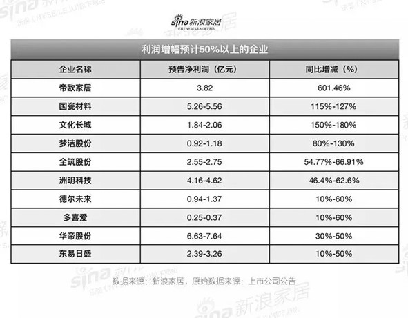 以上38家企业中,有10家增幅或达50%,4家或超100%。业绩增长主要得益于公司主营业务稳健、投资成功和核心技术的创新等。预计增幅超过100%的企业表示,超额增长与业务的拓展、企业重组并购等动作密切相关,帝欧家居通过并购佛山欧神诺陶瓷有限公司,实现601.46%的增幅;文化长城因并购翡翠教育业绩同期增长,国瓷材料因子公司王子制陶、深圳爱尔创、江苏金盛业绩纳入财报,实现增长;而梦洁股份通过市场拓展和终端零售改造,在2018年取得了巨大成效。