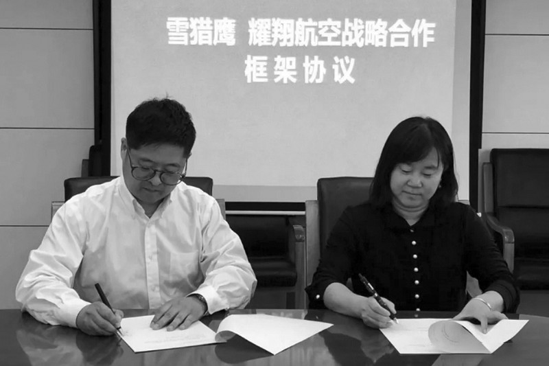 雪猎鹰航空技术(南通)有限公司董事长乌会敏先生和北京耀翔通航航空技术有限公司总裁金玉女士共同出席了签约仪式。
