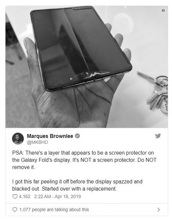知名科技达人MarquesBrownlee支持上述说法,他表示自己也以为屏幕保护膜可以取下来,就从两块屏幕的中轴线开始撕扯,结果屏幕马上“嗡嗡作响并且彻底黑掉了”。他因此警告其他消费者,这块薄膜并不是传统意义上的屏幕保护膜。