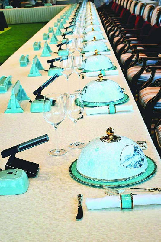 据了解,接到承办第二届“一带一路”国际合作高峰论坛午宴餐瓷的任务以来,高陶设计人员便开始了紧锣密鼓的工作。一边设计研发,一边烧制加工,一边修改调整,设计师们前期做了7种设计预案。根据此次国宴的餐品需要,最终主创设计师杨珍和她的设计团队选用蓝色和白色作为此次国宴用瓷的主色调,图案运用了中国传统的吉祥纹样宝相花和唐草纹为主要元素,融入中国的传统山水画,通过高温色釉珐琅彩以及手工描金等工艺来体现。