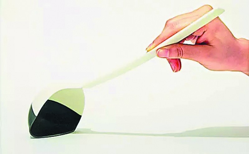 勺子的一半采用食用级硅胶制品,可以任意改变形状,当然这个形状是根据家中锅碗瓢盆的形状来改变,可以让使用者更完美的把锅碗瓢盆中每一个角落的美食都一扫而空。 悬空餐具