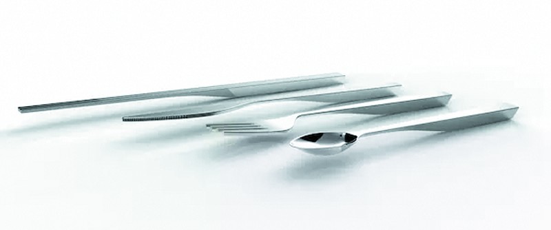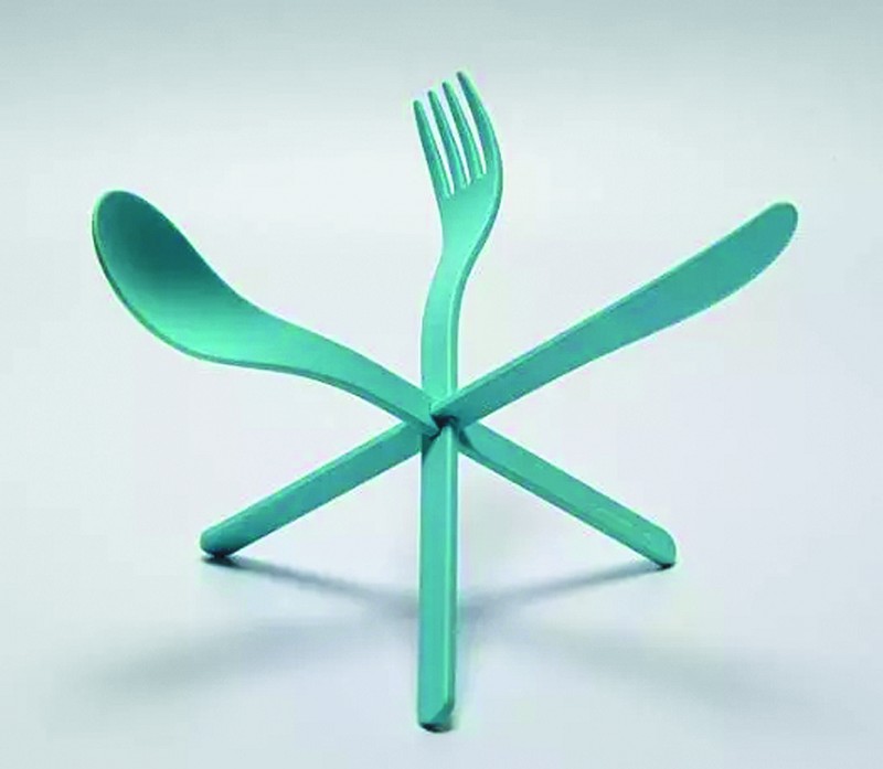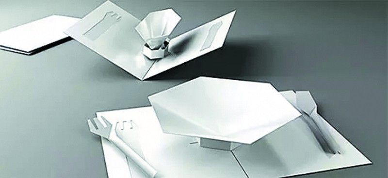 餐具选用一种无毒的塑料,它像立体贺卡一样,打开后就会弹出一套餐具,里面包括一只碗、一把叉和一把勺子。用完后,它可以放到水中清洗,然后再折回去,同样可以重复使用。