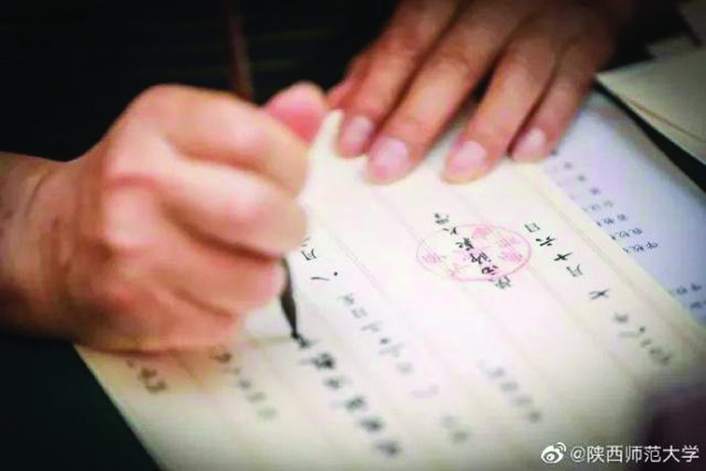 曾几何时,以毛笔字为主的写字课从小学课堂里渐渐退出而变成了社会上的业余课外兴趣班,大多数人敲击键盘十指如飞、提笔忘字,也变得形如蝌蚪。在传统书法距离我们越来越远的信息时代,陕西师范大学十二年“墨”守成规,一群年逾古稀的老教授执笔伏案,浓墨小楷,一笔一画,庄重地写下每个新生的名字。再加之宣纸材质、汉封泥印、剪纸剪影、祥云底纹,这是对传统的尊重,是对学生的尊重,充分体现着大学文化的底蕴,彰显着教育的温度。
