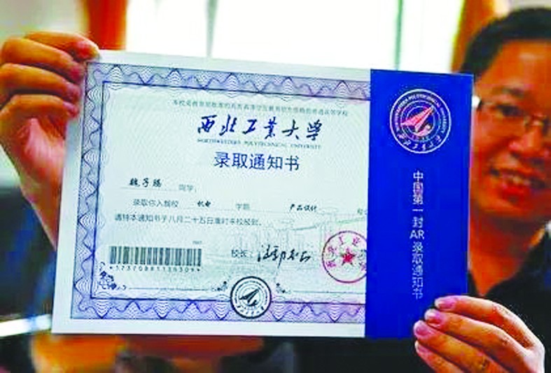 西北工业大学的录取通知书特别惊艳。西北工业大学是全国首个将AR技术引入录取通知书的高校。在手机上下载相关APP后,扫描通知书正面,手机画面里立即出现吉祥物“航小天”。它会为入学新生介绍西工大航空、航天、航海三大特色专业,还能查看校史介绍、学科特色展示等主题内容。虽然只是一张纸,但通过AR技术透出一种前沿的气质和自豪,是新科技应用的典范之作。(本报综合)
