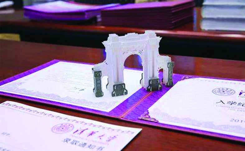 打开清华大学的录取通知书,3D“二校门”就会跃然纸上。里面有30多件纸艺部件,上百个拼插结构,经过激光雕刻、建材、拼插组装,彰显清华录取通知书的“妙手生花”。二校门是清华大学的标志性建筑,是清华自强不息、厚德载物精神的见证,是清华百余年历史的见证。它向即将跨入清华校门的学子们传递着清华的精神与文化,是期待更是激励,锻造灵魂、激发思想、涵养情怀、砥砺担当。