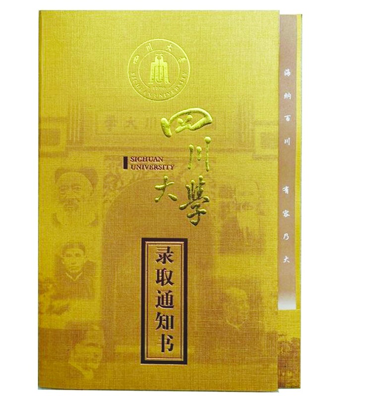 金粉磨砂纸质的封面灿灿发光,烫金浅浮雕的“四川大学”四字和正红加框的“录取通知书”更是金红相映、熠熠生辉。
