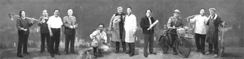 何红舟、封治国、尹骅油画《民族脊梁——共和国英模》组画之三。画面上的劳模从左至右依次为:申纪兰、史来贺、吴仁宝、鲁冠球、袁隆平、邓稼先、蒋筑英、包起帆、徐虎、杨怀远、李双良。