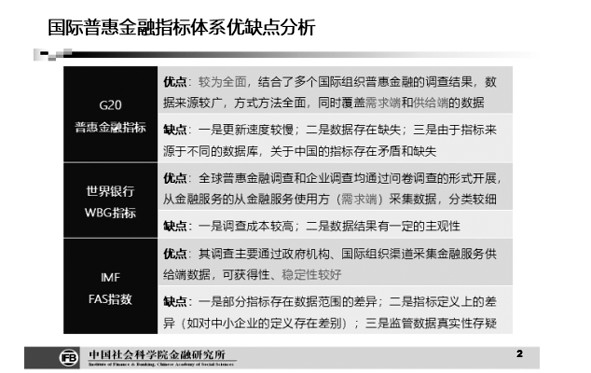 目前的《G20指标体系》是从金融服务使用情况、金融服务可获得性与金融服务和产品质量等三个维度出发。