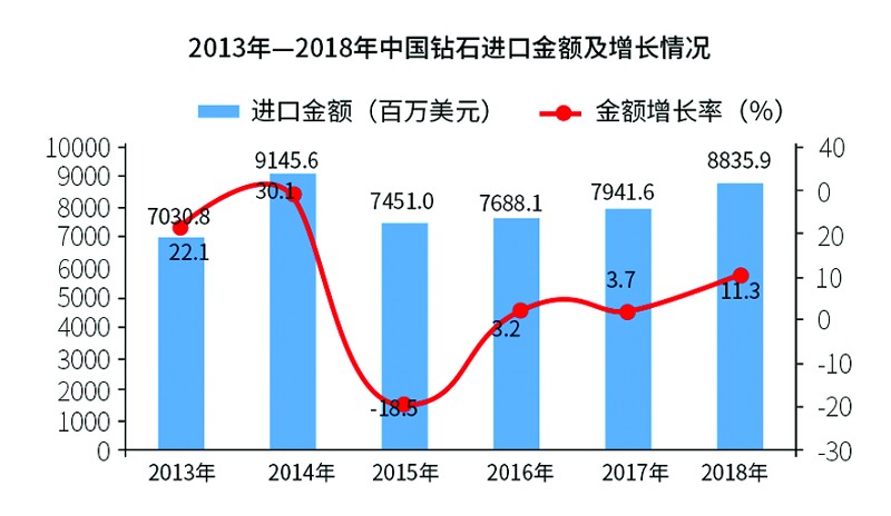 自钻石饰品兴起,至今已有三十余年,累计已产生超过一万亿人民币的销售额。2018年,我国钻石饰品销售额约为1100亿元。但由于国内钻石矿产极少,且达不到宝石级,几乎所有的钻石裸石100% 依赖进口。从金额方面来看,2015年—2018年中国钻石进口金额仍在增长,2018年中国钻石进口过关金额约为88.35亿美元,同比增长11.3%。