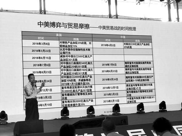 王建峰首先分析了中美贸易摩擦的一些发展趋势,近年来呈现出越来越密集的态势。从2018年开始,美国就发起了多项针对中国的贸易壁垒。2018年3月8日,美国对进口中国钢铁产品加征25%关税,对铝制品加征10%关税;2018年3月22日,美国认定中国存在强制性技术转让行为;2018年7月6日,美国对中国出口美国的340亿美元商品加征25%的301关税;2018年9月24日,美国对中国出口美国的2000亿美元商品加征10%关税。2019年5月10日,美国宣布对2000亿美元中国输美商品关税税率提升至25%。而2019年8月24日,美方宣布将提高对约5500亿美元中国输美商品关税的税率。