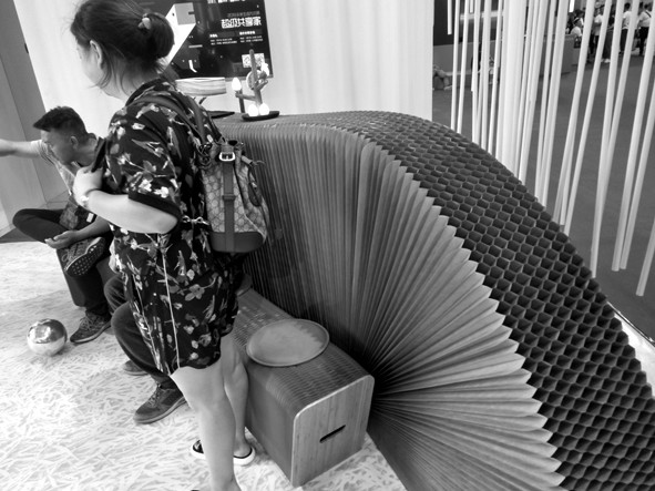 本报曾经报道过用纸做的家具作为一种特殊材质的新产品,开始出现在市场和家具展上,不过那时候的纸家具,唯一的亮点在于低碳环保的材质——纸,其余的诸如颜色、造型、舒适感等其他家具设计要素,并没有多大亮点,整个纸家具看起来就是一个灰扑扑的纸板坐具。日前,消费日报记者在2019中国全屋整装定制展上发现了一款新的纸家具,和原来的纸家具比起来,不仅造型上更美观、体积也更大,使用更舒适,吸引了不少观众驻足参观,体验。