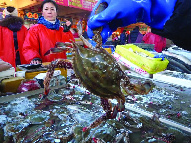 记者发现,今年市场上不再是大闸蟹一家独大,面包蟹、帝王蟹、梭子蟹等蟹类也“爬”上市民餐桌。“往年大闸蟹吃得太多了,今年想换个尝尝。”正在挑选螃蟹的王女士对记者说,最近每次来超市,都被水缸里爬来爬去的梭子蟹吸引,这种蟹个头不小,促销价29.9元一只,也十分划算,做一盘梭子蟹炒年糕,配上菊花茶,也是一种别样的享受。