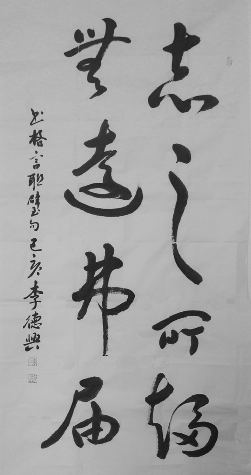 李德兴 1949年生,大学本科学历,退役军人。曾任河北省见义勇为基金会理事长,现为河北省书法家协会会员,河北省美术研究会顾问。曾多次组织书画家进社区、进农村、进校园、进军营、进企业、进革命老区等话动,许多书法作品在省级以上的展览中参展、入集、获奖或被单位、个人收藏。