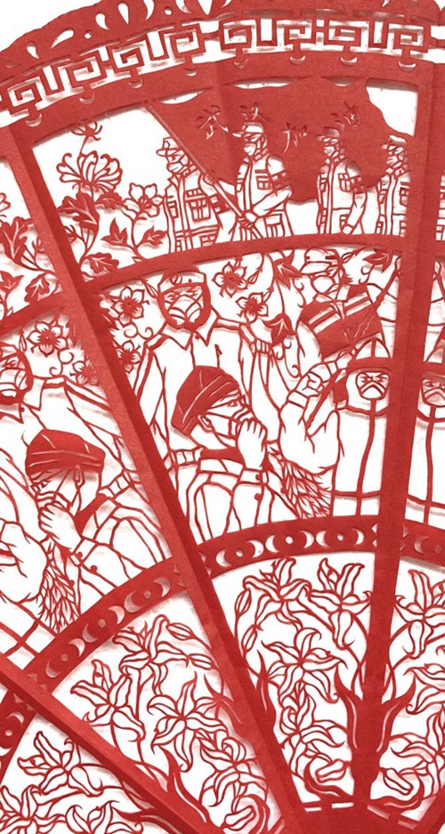《抗“疫”先锋》展现了穿着防化服的一线人员、誓师的医护工作者、驰援的军人、坚守的环卫工人和快递小哥共战疫情的生动画面。作品用象征团结的团花表现千千万万抗疫工作者的众志成城,用牵牛花寓意全国人民手牵手心连心克服疫情的决心,用百合花寄托平安和顺的美好祝福。