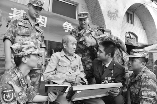 “年轻人好样的,这么多军功章,你要继续努力奋斗,虽然咱们都退役了,但要时刻牢记自己曾是一名军人……”在94岁老兵武永耀家中,武老边抚摸着他的军功章,边讲着故事。坐在旁边他湿润了眼睛,握着老兵的手说:“您当年的战斗故事是那么艰辛,当年要是没有你们的流血流汗,哪有我们今天的幸福生活。我一定会传承好老兵精神,继续发扬二等功臣的优良作风,争取为国家做出更大的贡献。”