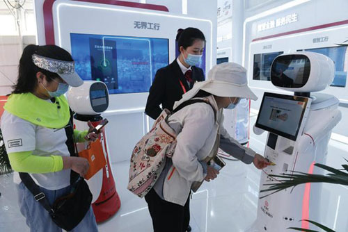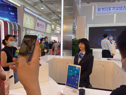 和仿真机器人大堂经理对话、通过数字可视化大屏和VR数字化展厅展示、互动游戏、视频直播等环节,观众亲身体验大数据、云计算、人工智能、区块链等新技术,展区内各金融机构纷纷“秀”出金融支持服务贸易新应用。