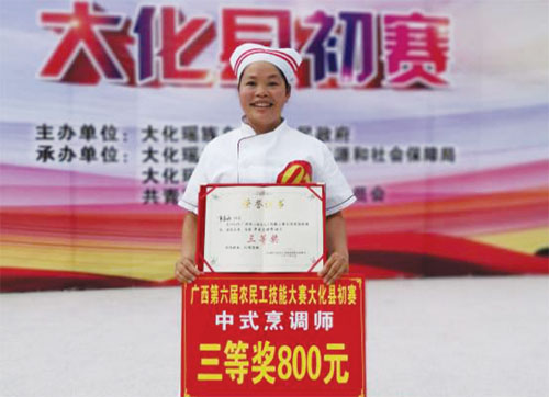 2020年5月,碧桂园的粤菜师傅培训开到了家门口,在学员的口口相传下,韦大姐报名参加了培训,结业后在广西农民工技能大赛大化县初赛获得了“中式烹调师”三等奖。“粤菜色香味俱全,原滋原味不辛辣,刚好符合大化的饮食特点。现在店里增加了广东肠粉,得到很多客人的青昧,小店终于红火了起来!”