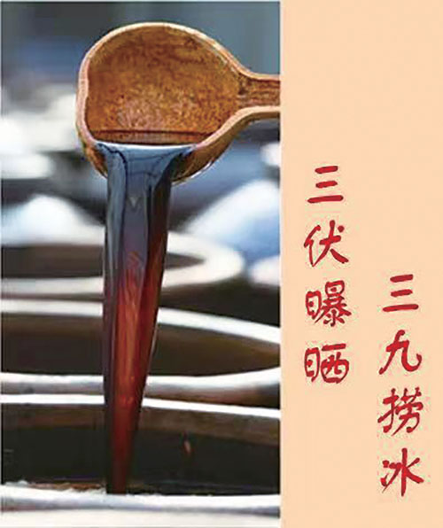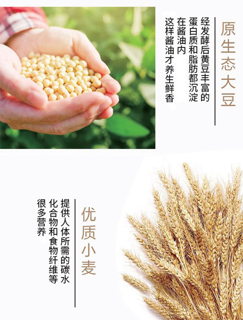 纯天然手工传统发酵,保留了传统工艺,发酵好的原材料,再加入一定比例的海盐水,进入二次发酵,呈稀醪状。此工艺是高盐稀态发酵,与空气、阳光相接触较多,日晒夜露,耐高温菌代谢较好,故香气较重;液态发酵色泽较清淡,发酵一整个夏季,用时七个月之久,每天浇淋,到秋季出油时,在缸内插入竹篓,将油抽出后高温消毒,最后在无尘车间中完成灌装。