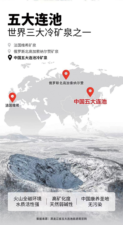 五大连池位于黑龙江省北部、黑河市南部,地处小兴安岭与松嫩平原的过渡地带。泉水温度一般在3℃—5℃,最高温可达14℃,最低温可到1℃,位居世界三大冷泉之首。1996年五大连池市被命名为“中国矿泉水之乡”。五大连池火山群内出露的矿泉有40多处,域内矿泉资源独特珍稀,含有钾、钠、锌等20多种对人体有益的微量元素,对消化系统、神经系统疾病有良好的保健作用。五大连池有铁硅质、镁钙型重碳酸低温冷矿泉水,天然含汽,可饮可浴;有偏硅酸、氡等类型矿泉水。又因其水源地取水有限,产量稀缺,五大连池的水又被称为“黄金水”。