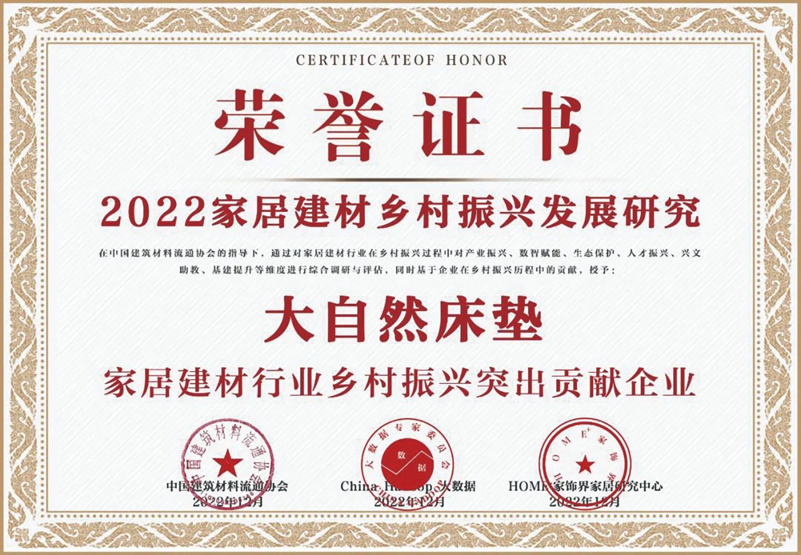 本报讯 12月12日,“弘扬时代先锋、建设质美中国——2022家居建材行业乡村振兴发展报告”在京发布。大自然床垫凭借多年来在乡村振兴工作中的付出和贡献,荣获2022中国家居建材行业乡村振兴突出贡献企业称号。