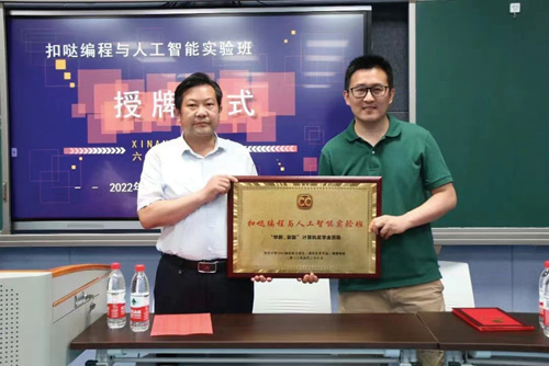 2022年,张伟胜校长和王成仓校友为“扣哒编程与人工智能实验班”授牌