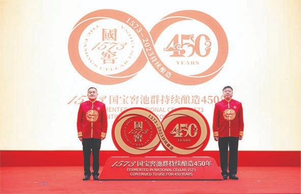泸州老窖集团及股份公司党委书记、董事长刘淼,泸州老窖股份有限公司党委副书记、总经理林锋共同为1573国宝窖池群持续酿造450年纪念标志揭幕