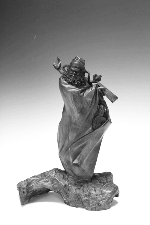 余黎明的代表作檀香木《三十三观音》就是一件融汇深厚技艺与灵巧匠心的作品,该作品在有限的材料中运用透雕、镂雕、浮雕等手法,运刀如笔,心手相应,融抽象、意象、具象于一炉,实现“天人合一”的境界。作品《钟馗百态——四品》则既有温婉细腻的精细刻绘,又有大刀阔斧的取舍,呈现出雅俗共赏的艺术魅力,体现出匠人“入木三分”的纯熟技法。
