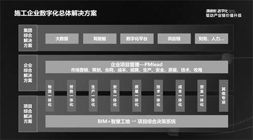 毕鹏飞还强调:广联达项企一体化解决方案通过数据控制生产的物料一体化(物资管理)、项企一体助力全业务流程劳务管控(劳务管理)、全面计划联动的计划管理体系(生产管理)、筑牢安全管理三道防线(安全管理)等业务场景“分层”建设,最终将企业和项目融为一体,形成联动闭环。项目级综合解决方案围绕生产活动和生产要素,针对不同流程和业务场景进行精细化管理,用数字驱动项目实现优质化履约,而企业级综合解决方案则贯穿于投标、策划、履约、竣工等商务全流程,通过成本全过程管控,使人管变成数管、事后变为事前,以盈利为目标,最终提升均质化履约能力。
